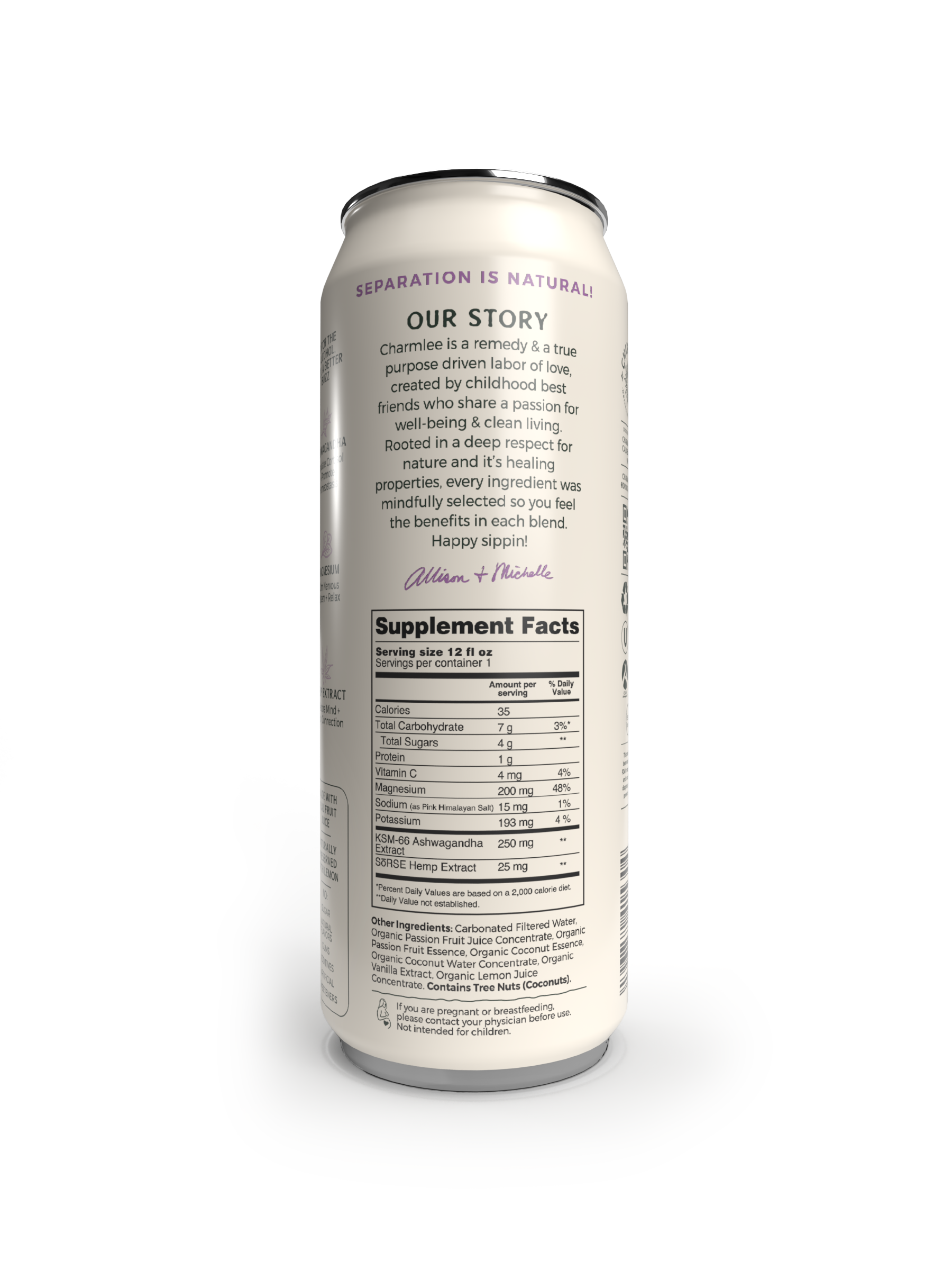 Carbonated Filtered Water, Organic Passion Fruit Juice Concentrate, Organic Passion Fruit Essence, Organic Coconut Essence, Organic Coconut Water Concentrate, Organic Vanilla Extract, Organic Lemon Juice Concentrate, Magnesium Glycinate, Organic Ashwagandha Extract, Hemp Extract